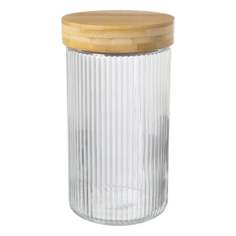 Bewaar je etenswaren stijlvol in deze voorraadpot met bamboe deksel. De pot heeft een inhoud van 1,5 liter. Handig voor het opbergen van rijst, pasta of ontbijtgranen. Zet meerdere voorraadpotten met diverse afmetingen netjes op een plank in je keuken of voorraadkast voor een mooi georganiseerde opslagoplossing.