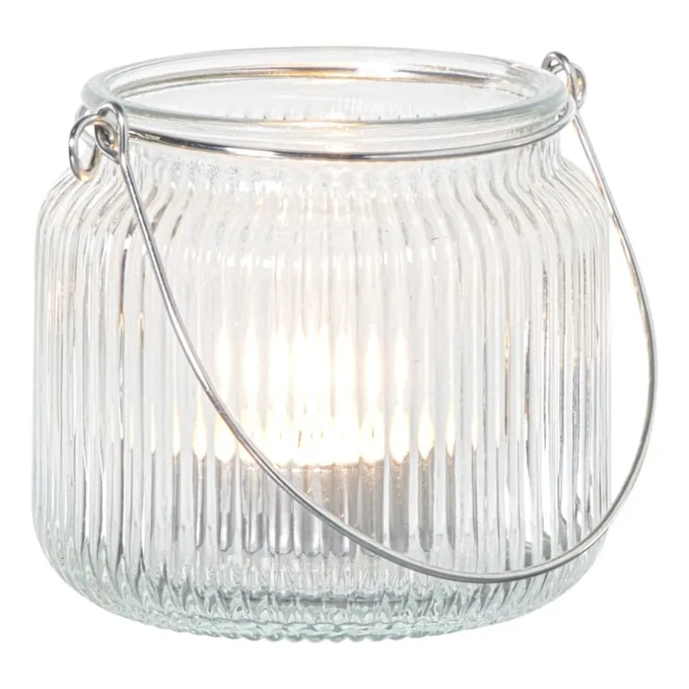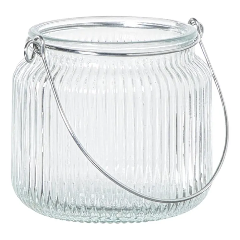 Deze stijlvolle waxinelichthouder met hengsel is een sfeermaker van formaat. Gemaakt van geribbeld glas in een frisse transparante tint, verspreidt hij het kaarslicht op een warme en speelse manier. Dankzij het metalen hengsel kun je hem makkelijk verplaatsen of ophangen voor een gezellig effect in de tuin, op je balkon of gewoon binnen. Combineer er meerdere voor een speels groepje of laat hem solo stralen.