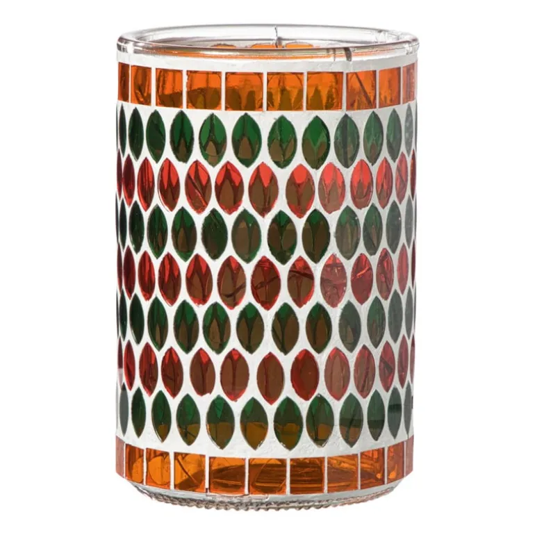 Breng warmte en sfeer in huis met deze kleurrijke waxinelichthouder. Het mozaïekpatroon van oranje en groene glassteentjes geeft een speels en gezellig effect, zeker wanneer er een kaarsje in brandt. Het licht schijnt prachtig door de glaskleur heen en zorgt voor een warme gloed in de ruimte.Perfect voor op tafel, in de vensterbank of als sfeermaker tijdens een gezellige avond. Combineer deze waxinelichthouder met andere mozaïekdecoraties voor een harmonieus geheel of laat hem stralen als opvallend accent.