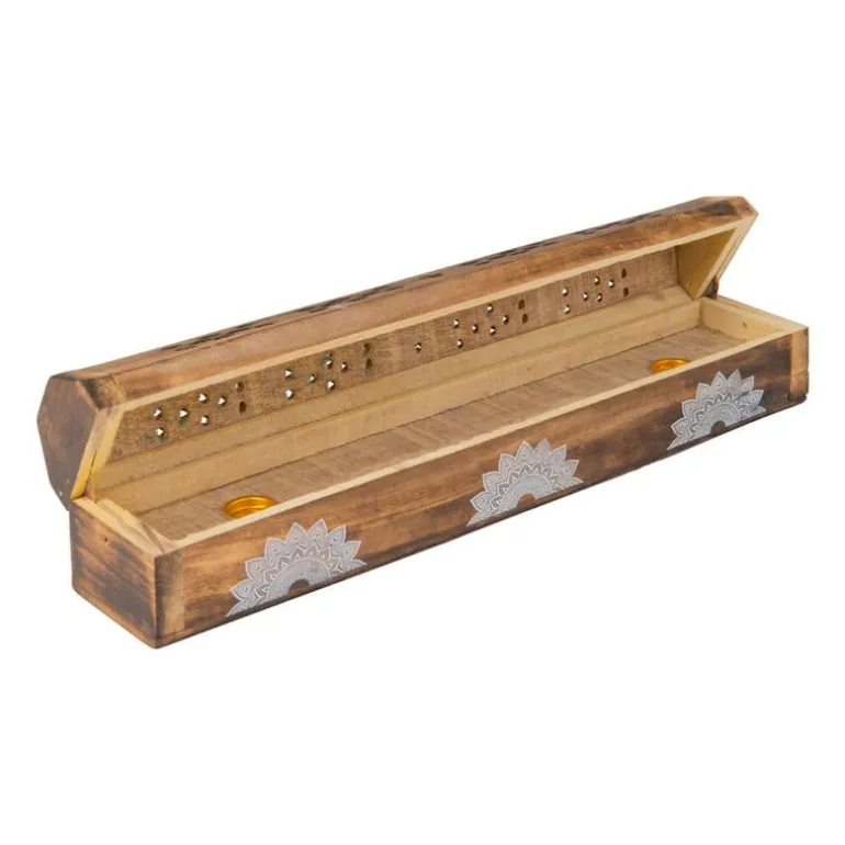 Dol op wierook branden? Deze houten doos is geschikt om wierook in te bewaren én om wierook op te branden. Deze sfeervolle wierookdoos/wierookbrander staat sfeervol in je interieur. De doos is voorzien van witte mandala prints.